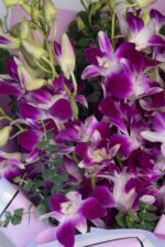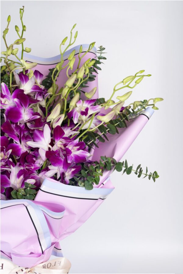 Purple orchids and eucalyptus leaves arranged as a hand bouquet.